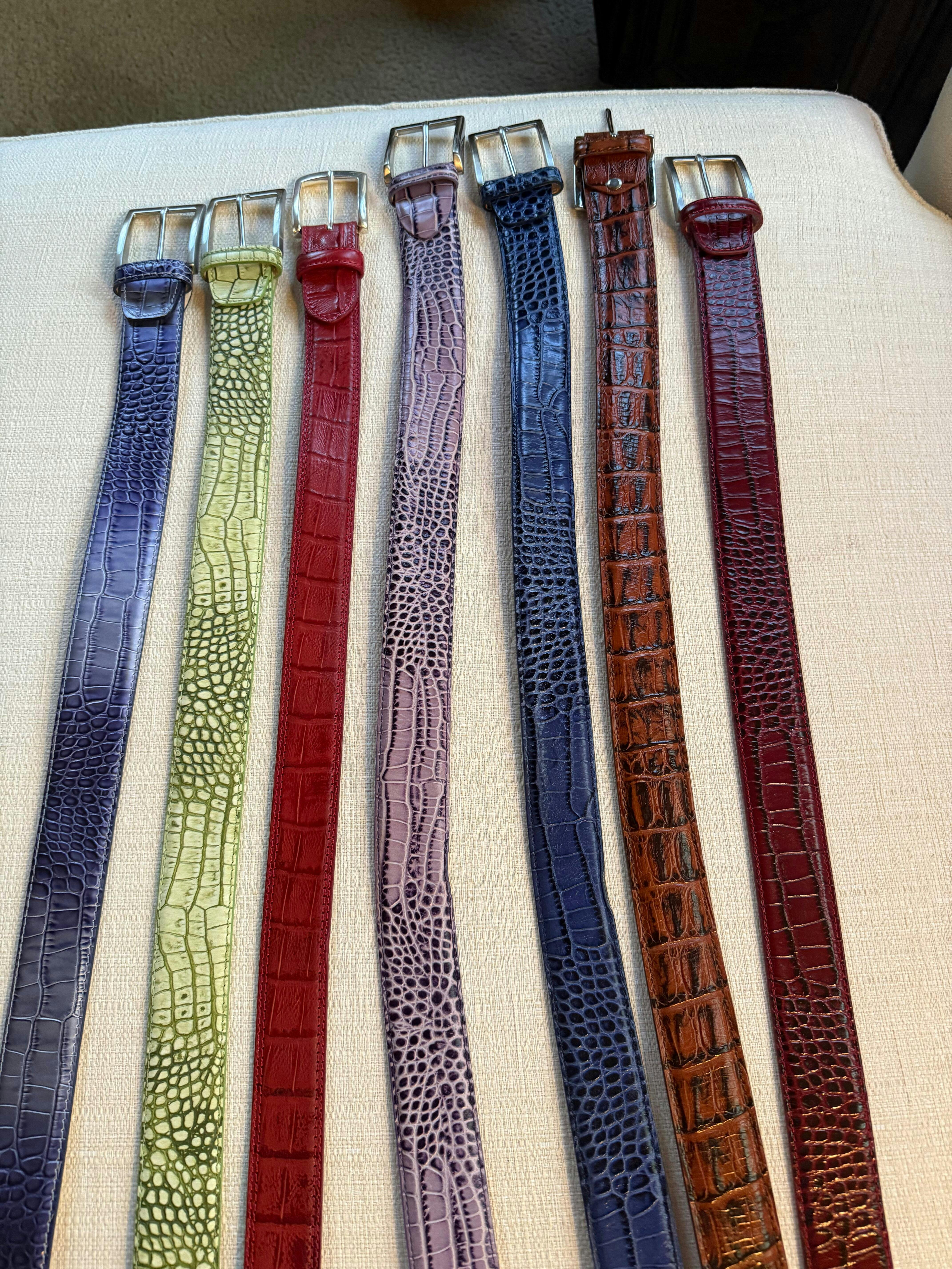Our embossed mock skin belts are crafted from full grain calf skin leather with special fibers between the belt’s leathers for added flexibility and durability.
